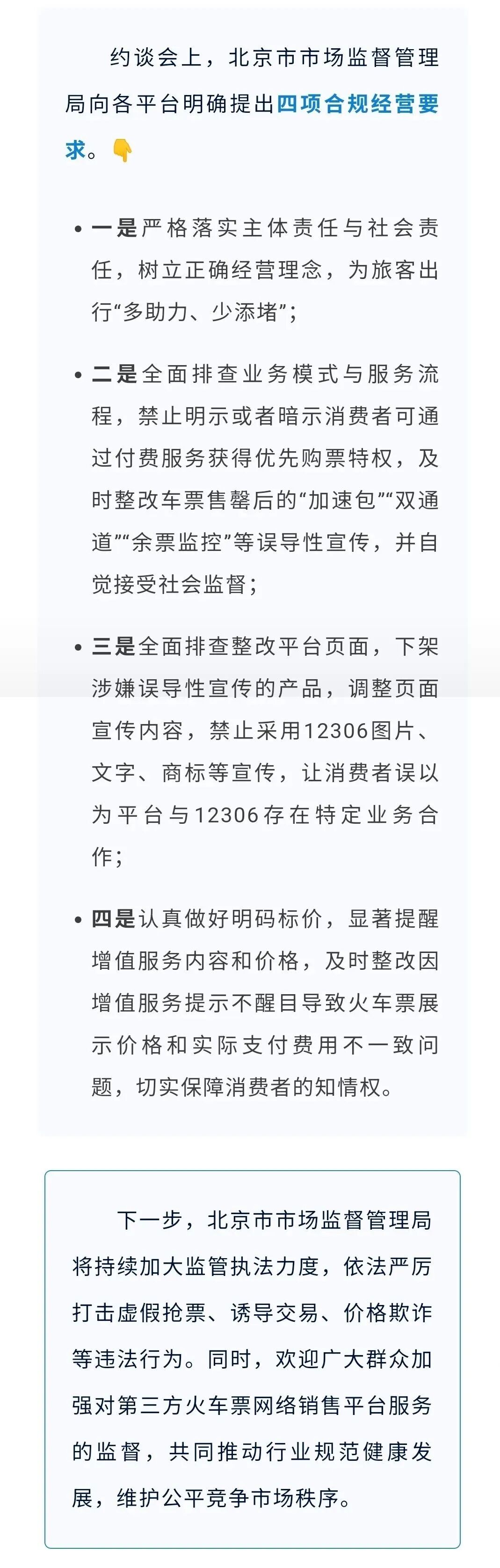 近日,北京市市场监督管理局组织携程、去哪儿、飞猪、同程、美团、京东、航旅纵横、高铁管家、滴滴、高德地图、百度地图、腾讯地图等12家涉及火车票网络销售业务的主流平台,重点围绕群众反映强烈的网络销售火车票突出问题召开行政约谈会。
