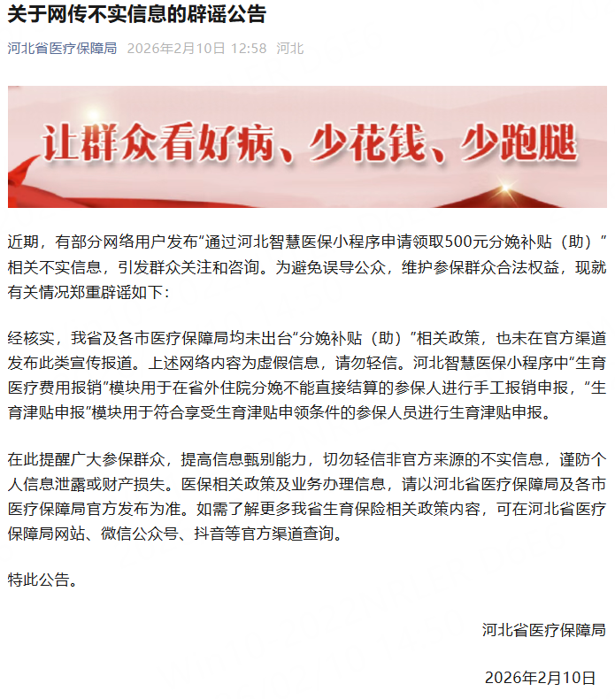 2月10日,河北省医疗保障局发布《关于网传不实信息的辟谣公告》,全文如下: