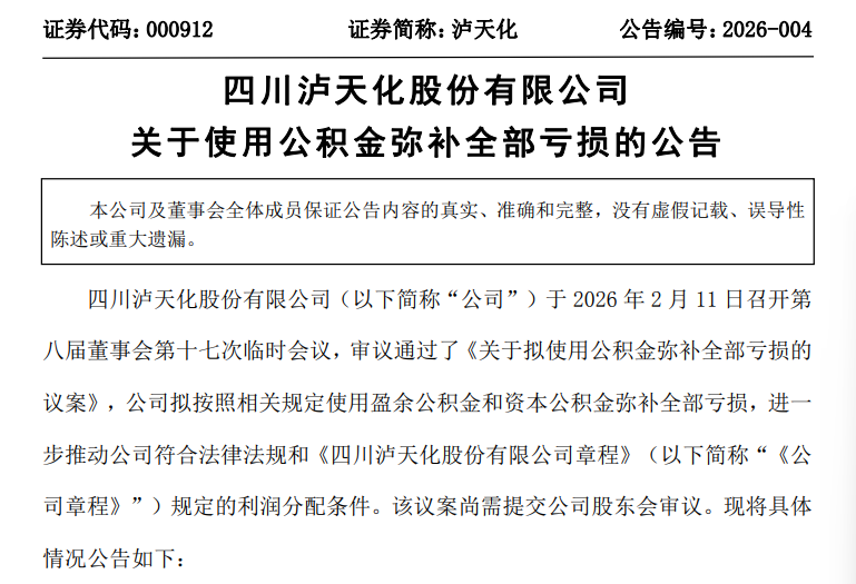 2月12日,四川上市公司泸天化发布公告称,公司拟使用盈余公积金和资本公积金合计9.41亿元,弥补母公司累计亏损,目的是为未来给股东发放现金分红创造合规条件,不过这一操作并不会直接增加当前股东的收益。