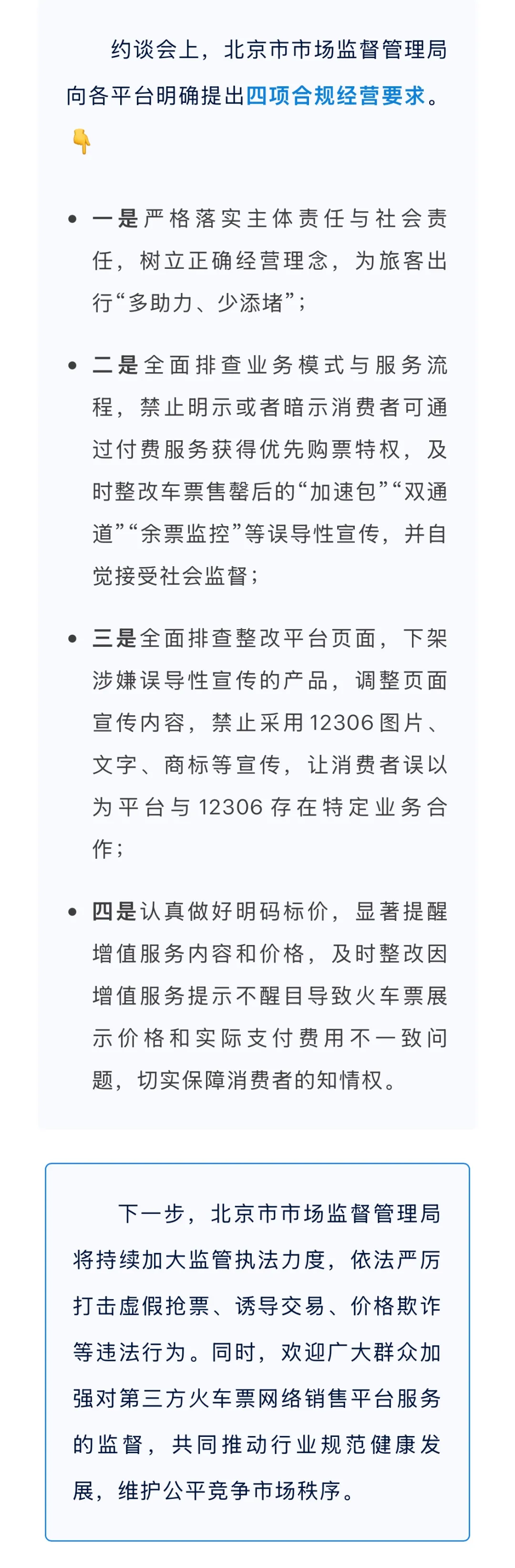 近日,北京市市场监督管理局组织携程、去哪儿、飞猪、同程、美团、京东、航旅纵横、高铁管家、滴滴、高德地图、百度地图、腾讯地图等12家涉及火车票网络销售业务的主流平台,重点围绕群众反映强烈的网络销售火车票突出问题召开行政约谈会。