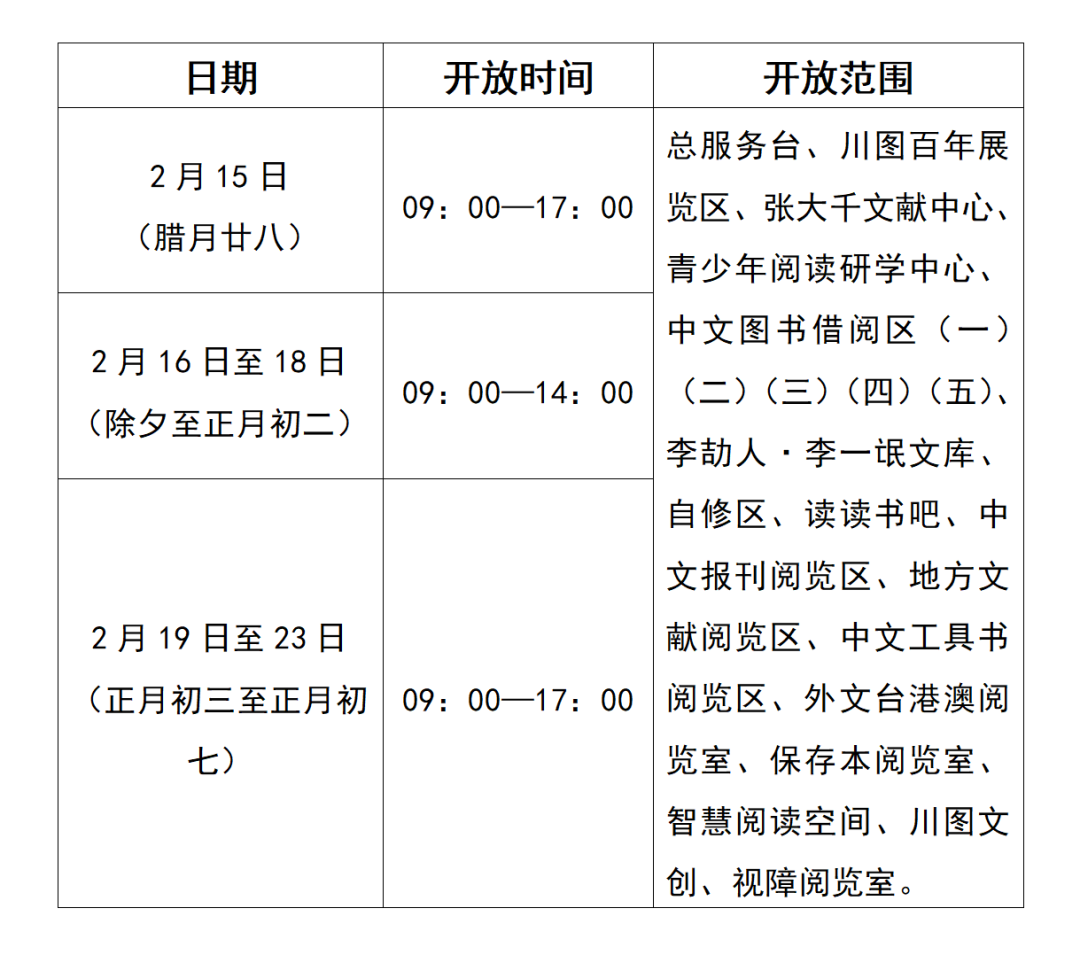 四川省图书馆日前发布2026春节开馆安排,2月15日—2月23日期间,将对外提供借阅、办理还书和咨询服务。详情↓↓