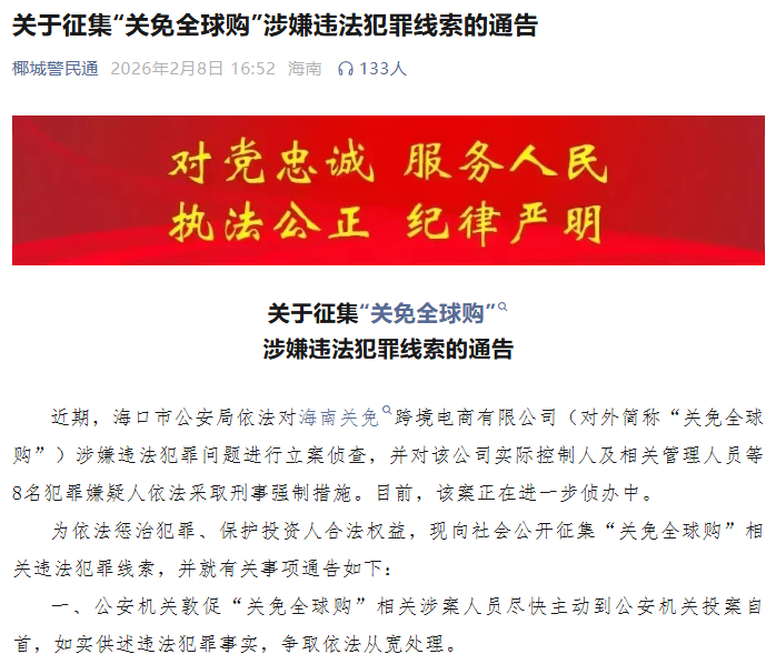 海口市公安局2月8日通告,近期,海口市公安局依法对海南关免跨境电商有限公司(对外简称“关免全球购”)涉嫌违法犯罪问题进行立案侦查,并对该公司实际控制人及相关管理人员等8名犯罪嫌疑人依法采取刑事强制措施。目前,该案正在进一步侦办中。