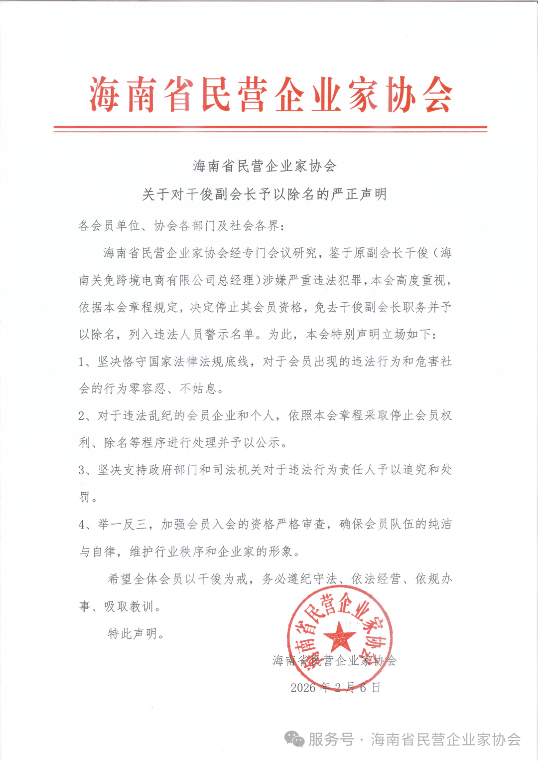 海南省民营企业家协会微信公众号2月10日晚发布《关于对干俊副会长予以除名的严正声明》: