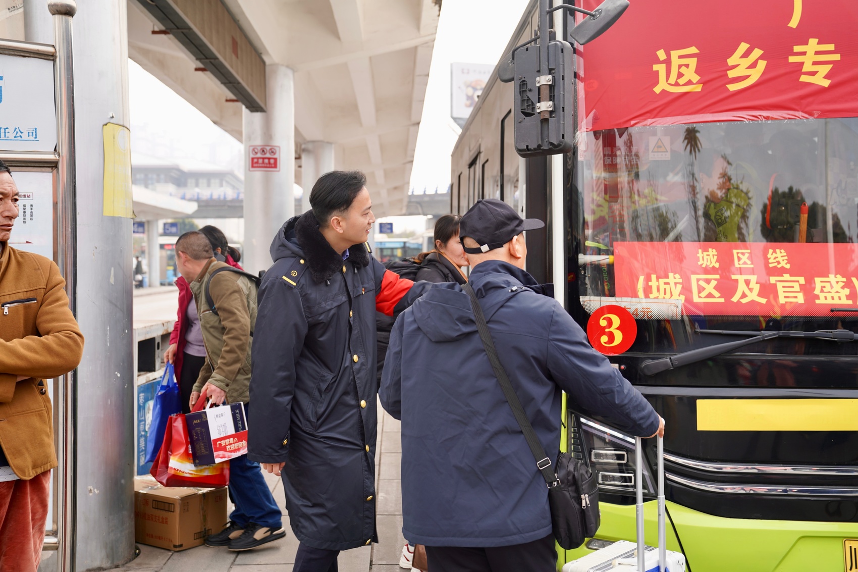 站台上,阳光照在志愿服务队的红绶带上。志愿者接过行李,引导大家有序下车,一句句“欢迎回家”的问候,驱散了乡友们旅途过程中的疲惫。