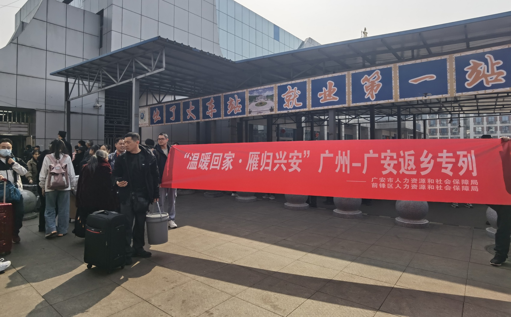 在广安站,服务队、志愿者为务工人员提供引导,确保务工人员安全回家。(罗海韵 摄)