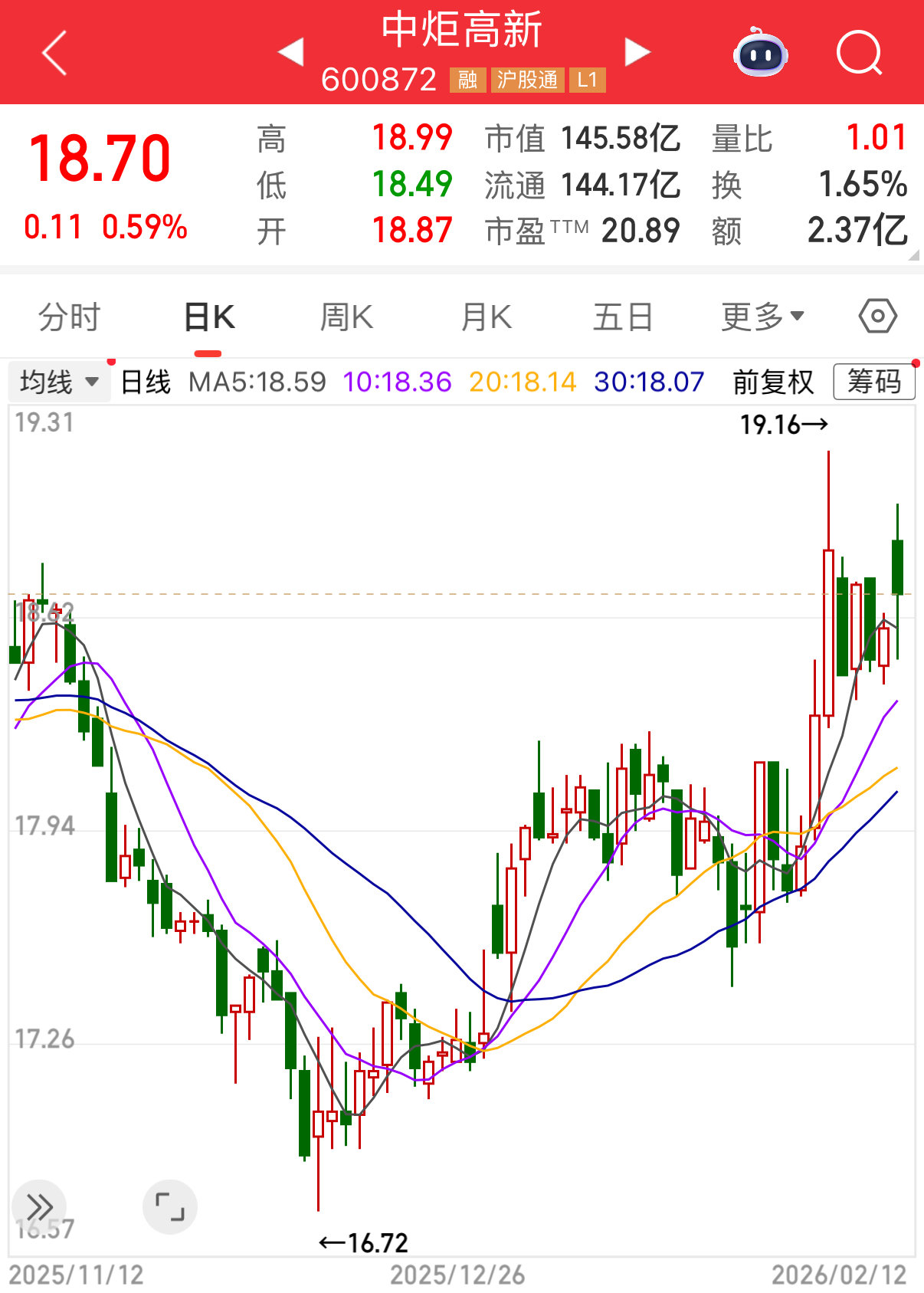 二级市场方面,截至2月12日收盘,中炬高新股价报18.70元,微涨0.59%,总市值145.58亿元。