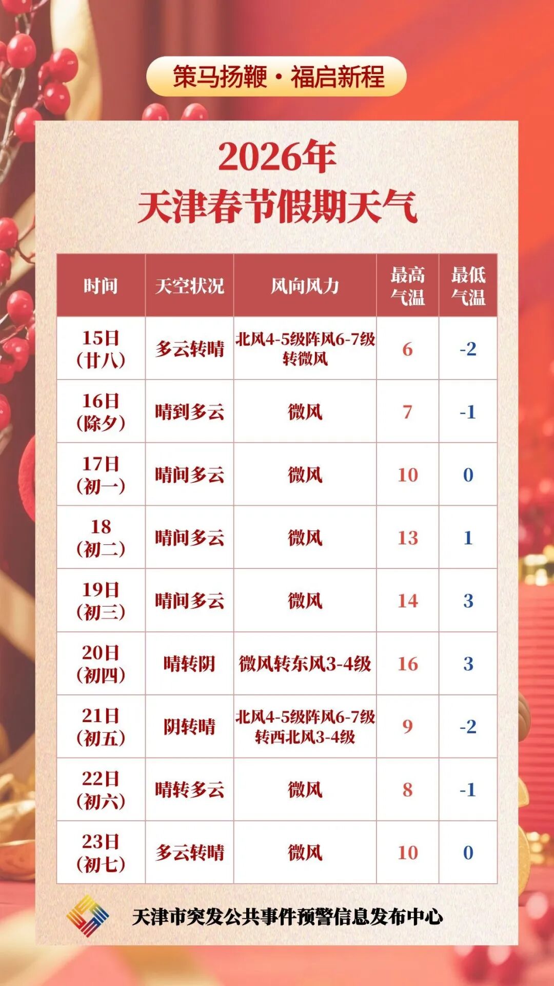王颖介绍,这次冷空气过后,在16日到20日(除夕到初四),我市都是以晴到多云天气为主,风力不大,气温呈现逐步回升的过程。预计20日最高气温会逐步回升到16°左右。