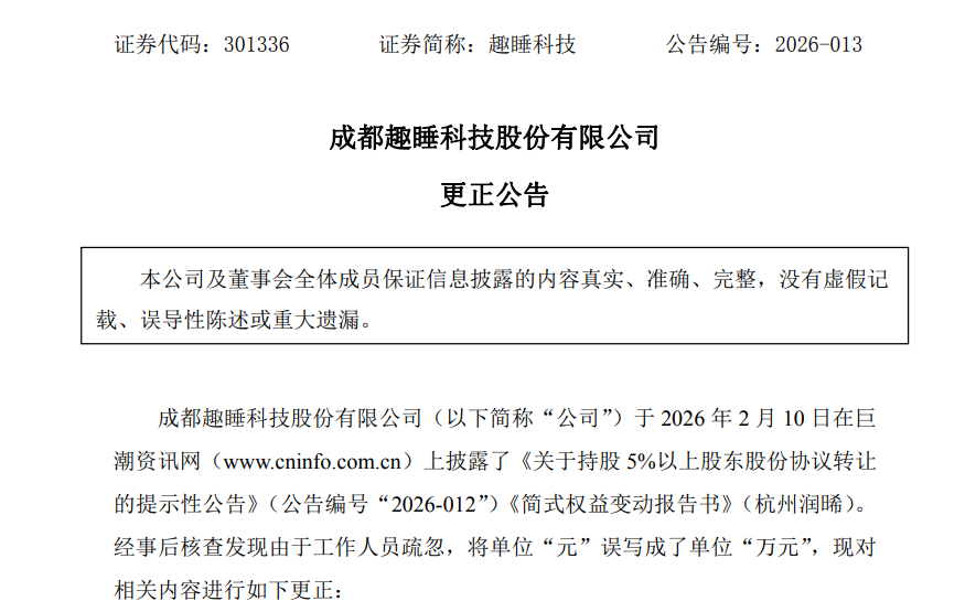 2月11日,趣睡科技发布更正公告称,在前一日披露的《关于持股5%以上股东股份协议转让的提示性公告》及《简式权益变动报告书》中,因工作人员疏忽,将交易金额单位“元”误写为“万元”,导致披露金额被放大一万倍。公司就此致歉,并承诺将加强信息披露审核工作。
