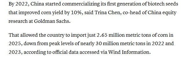 报道还称,中国在农业研究与开发方面投入巨大,2019年至2021年其公共部门在这方面的支出大约是美国的两倍。报道援引高盛中国股票研究部联席主管的观点称,到2022年,中国已开始将第一代生物育种产业化应用,这些种子使玉米产量提高了10%。报道还援引万得资讯获得的官方数据称,这使得中国在2025年的玉米进口量仅为265万吨,远低于2022年和2023年近3000万吨的峰值水平。
