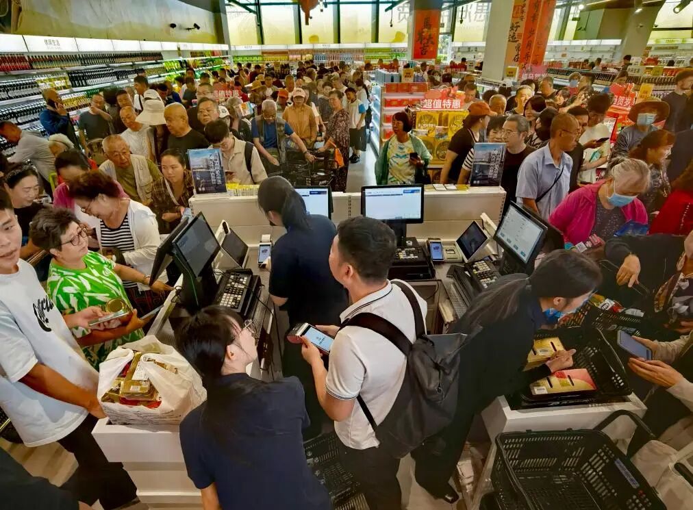 开业后,店内人头攒动,消费者推着购物车驻足挑选,收银台队伍不断延伸,入口处仍有市民陆续涌入。