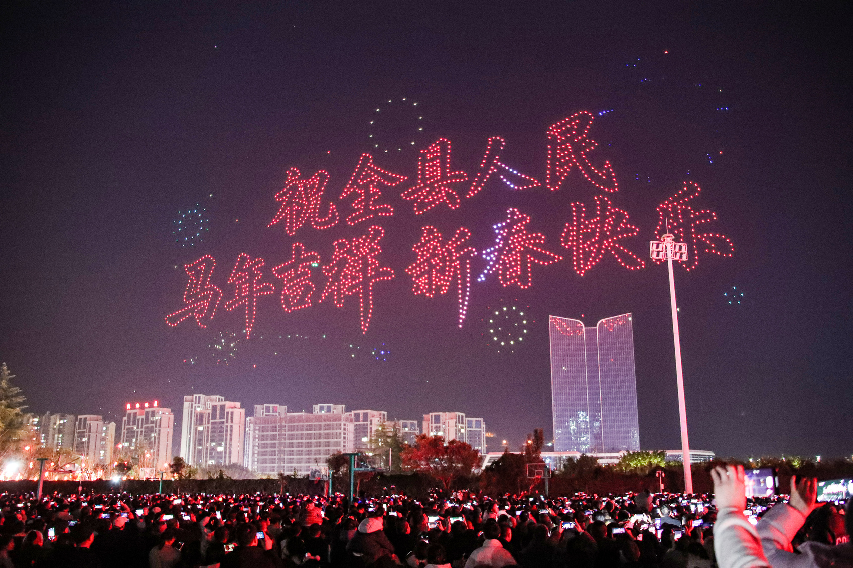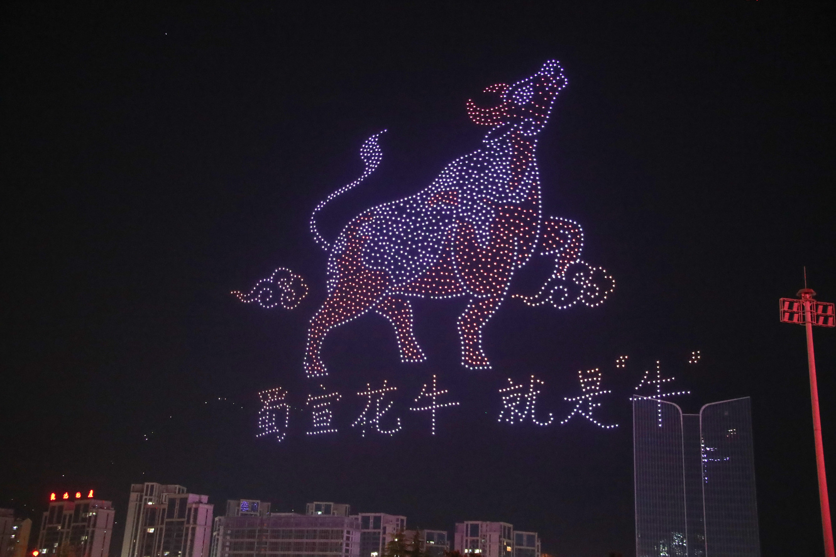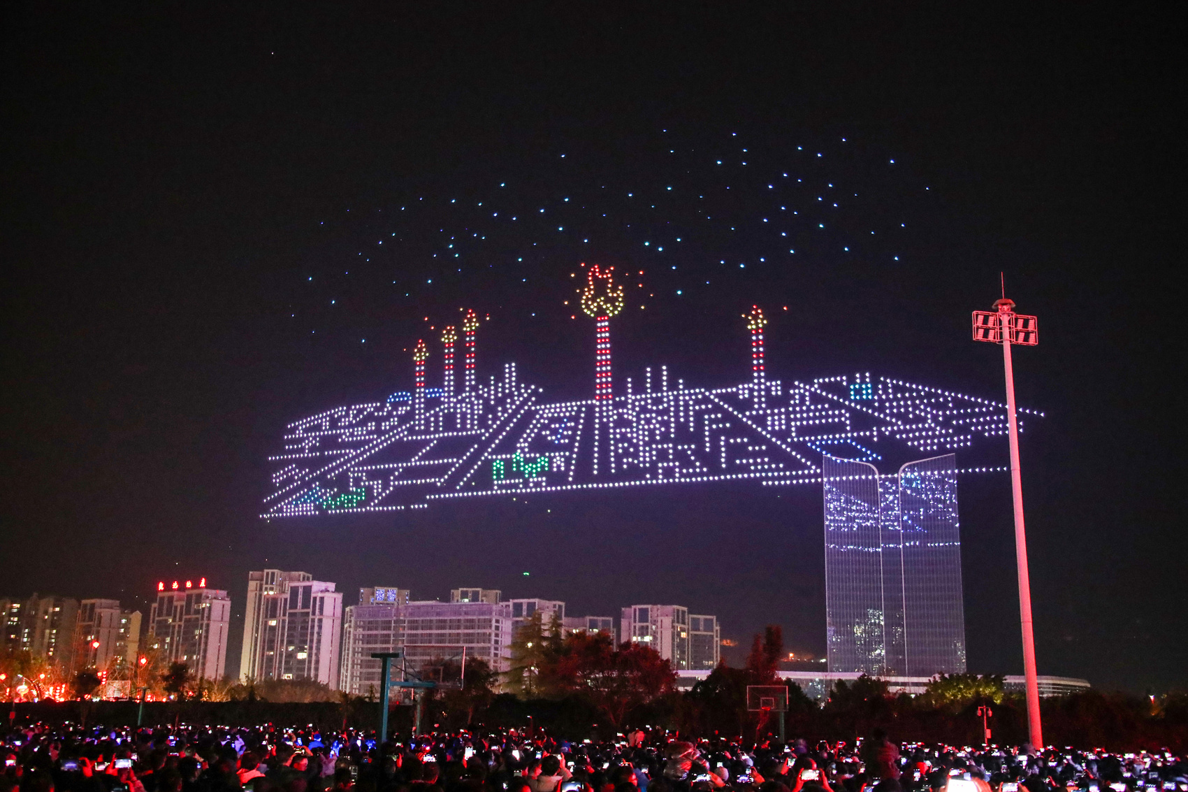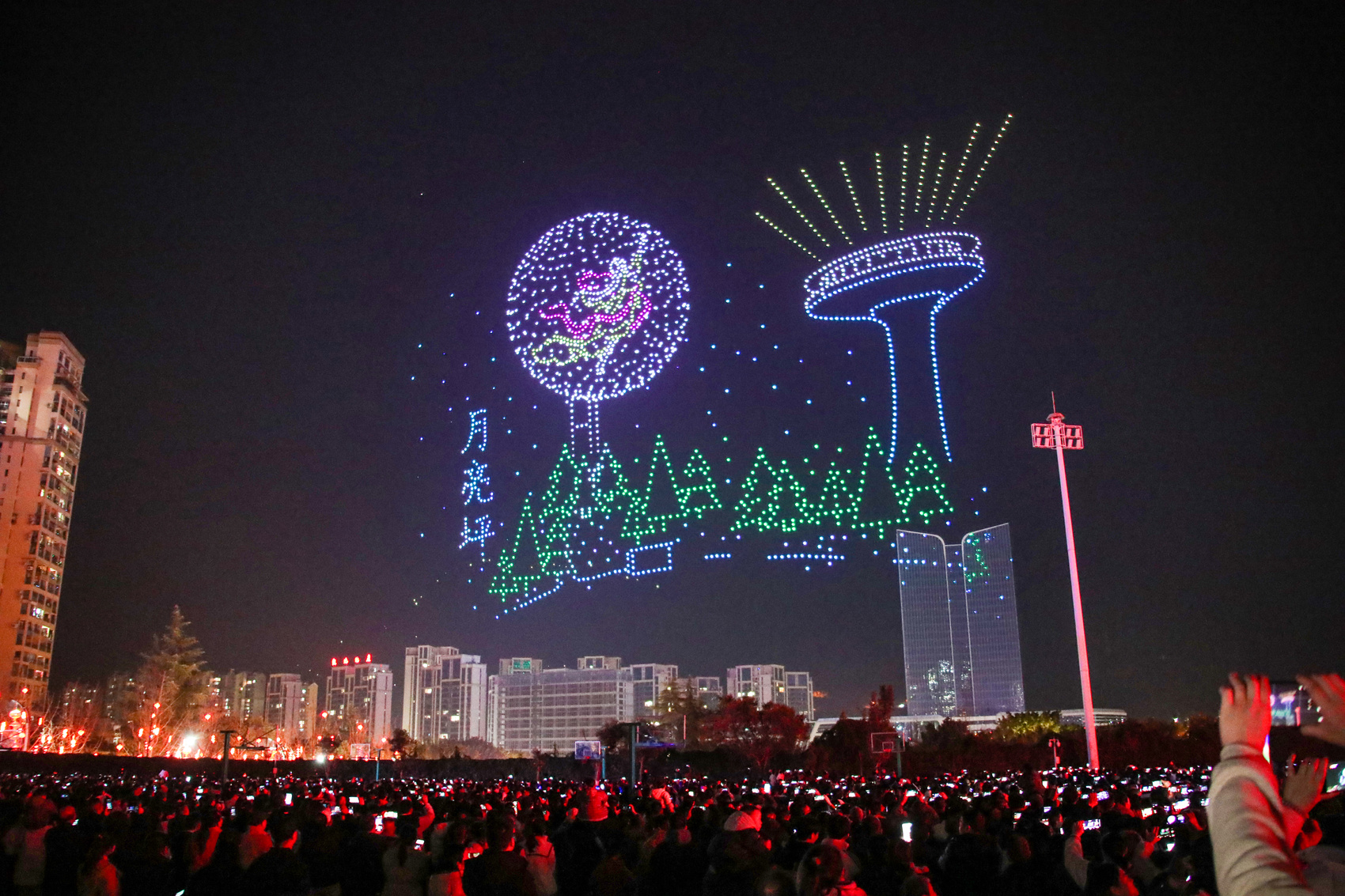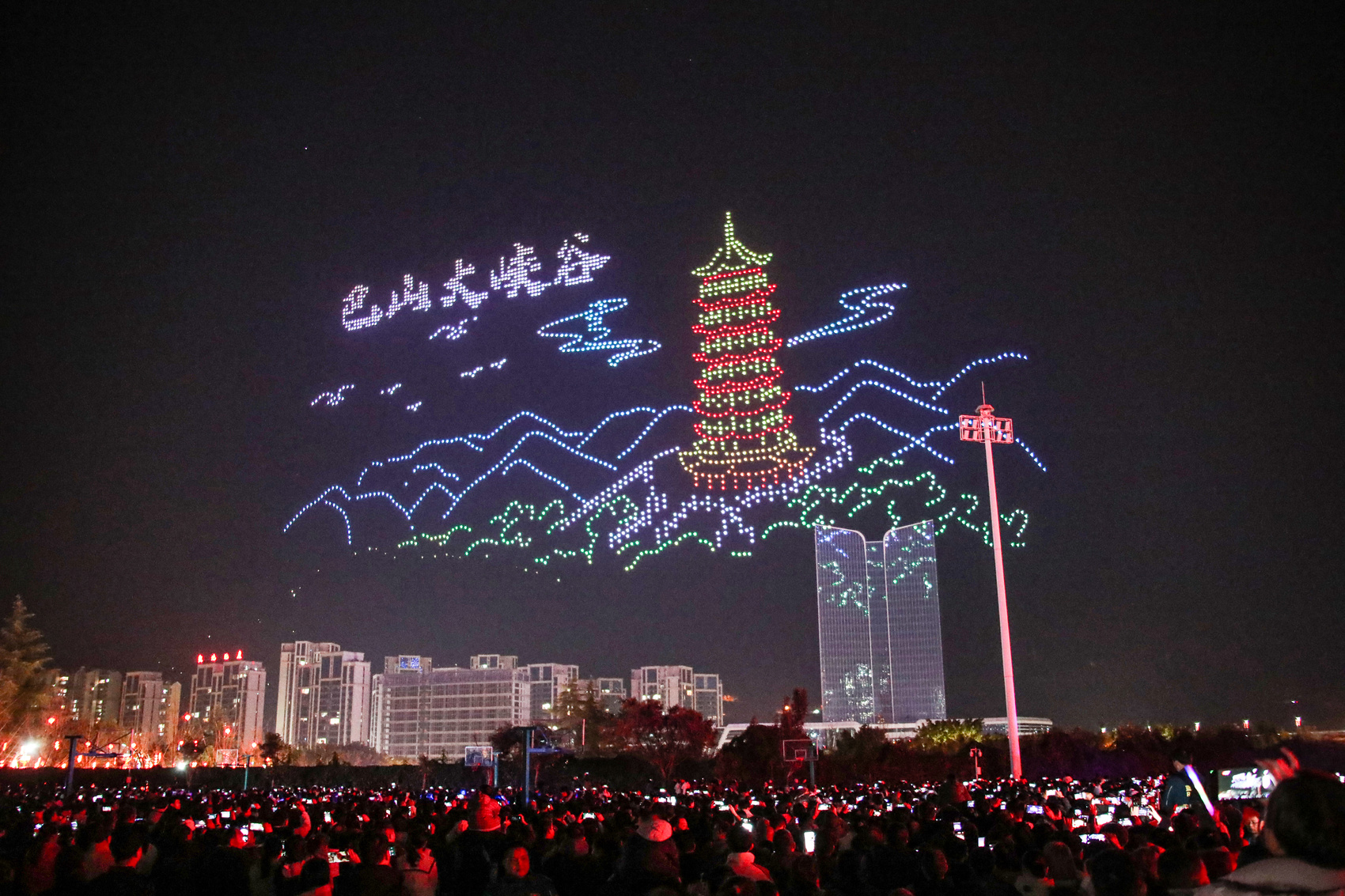 活动伊始,2000架无人机自宣汉县城笔架山下腾空,以天为幕,依次呈现13幅流光溢彩的空中画卷。