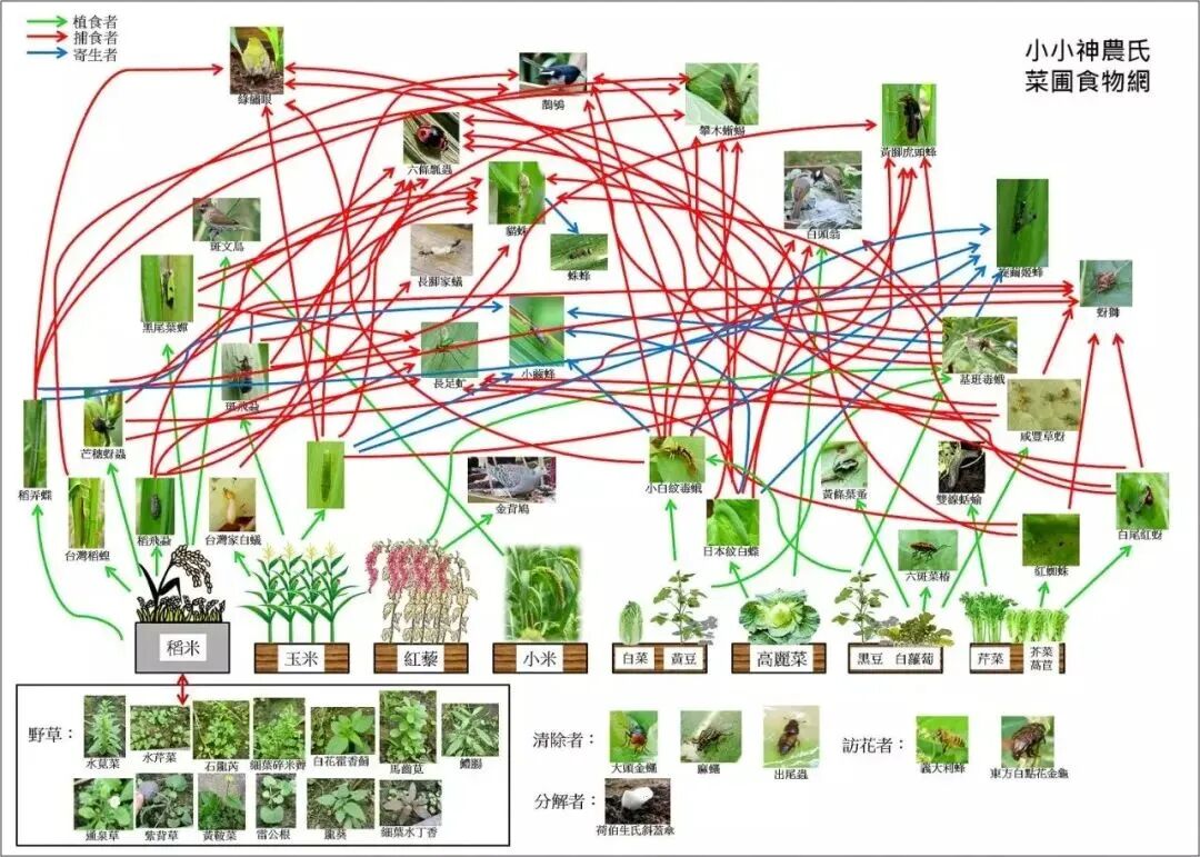 我们大多都知道在生态概念里表现生物多样性的一种方式叫做食物网 ,而构成农田食物网最基层的生物种类就是虫、草,当然还有作物,而土则是孕育出健康作物和野草多样性的重要因素,生活在土里的各种生物组成的土壤生物多样性更是土壤优良的重要关键。