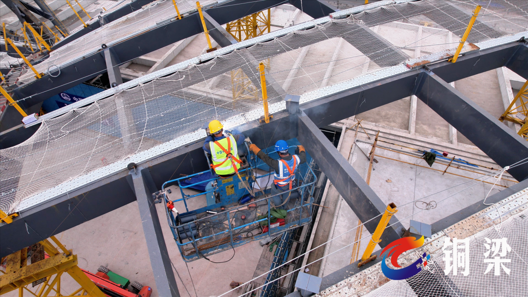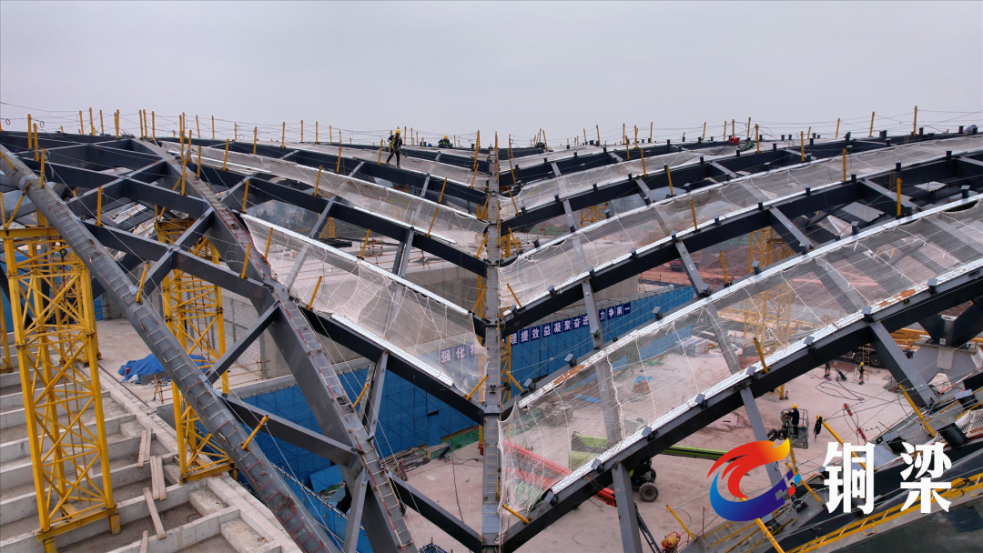 2月9日上午,在铜梁站施工现场,数十名工人顶着寒意在站房顶部开展焊接施工作业,钢结构穹顶已基本成形,一派繁忙有序的建设景象。