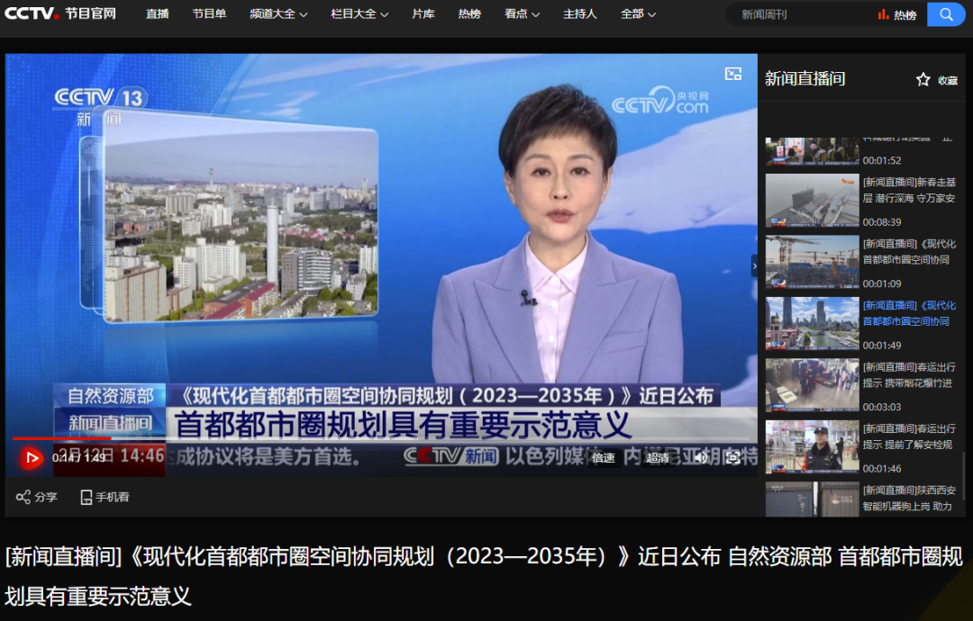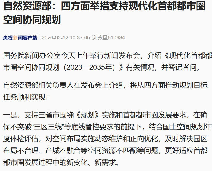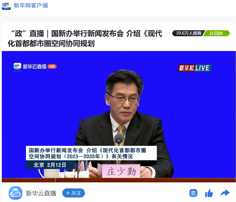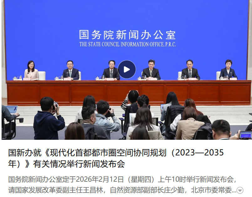 2月12日,国新办举行新闻发布会,介绍《现代化首都都市圈空间协同规划(2023-2035年)》。新华网客户端、央视新闻客户端、中国之声、中国网等媒体进行了报道。