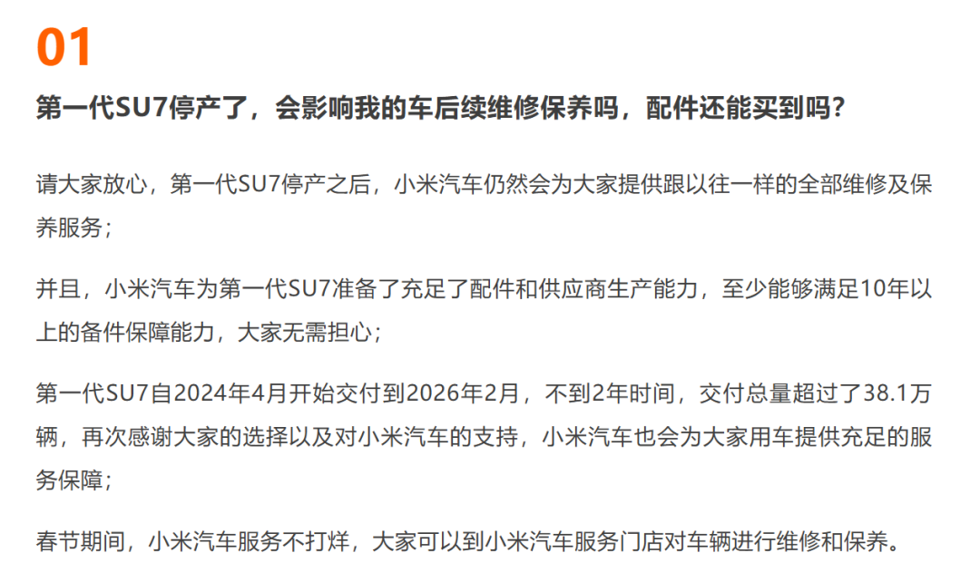 小米汽车2月12日晚间发布答网友问,文中提到,第一代SU7停产之后,小米汽车仍然会为大家提供跟以往一样的全部维修及保养服务;并且,小米汽车为第一代SU7准备了充足了配件和供应商生产能力,至少能够满足10年以上的备件保障能力,大家无需担心。