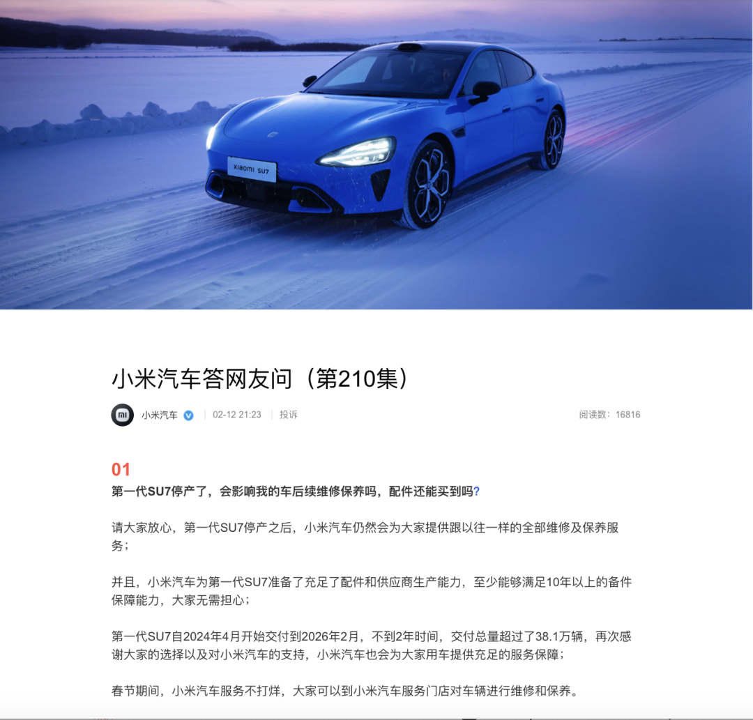 小米汽车2月12日晚间发布答网友问,文中提到,第一代SU7停产之后,小米汽车仍然会为大家提供跟以往一样的全部维修及保养服务;并且,小米汽车为第一代SU7准备了充足了配件和供应商生产能力,至少能够满足10年以上的备件保障能力,大家无需担心。