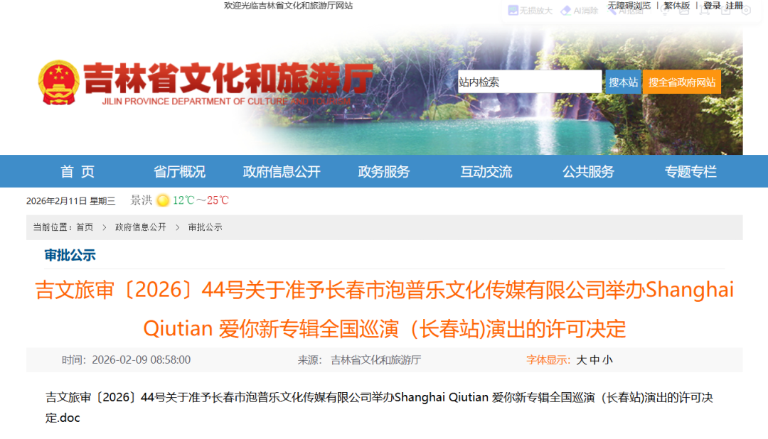 日前,吉林省文化和旅游厅发布《吉文旅审〔2026〕44号关于准予长春市泡普乐文化传媒有限公司举办Shanghai Qiutian 爱你新专辑全国巡演(长春站)演出的许可决定》,卢子健、石冬、呼格吉莫等歌手新来长春巡演。