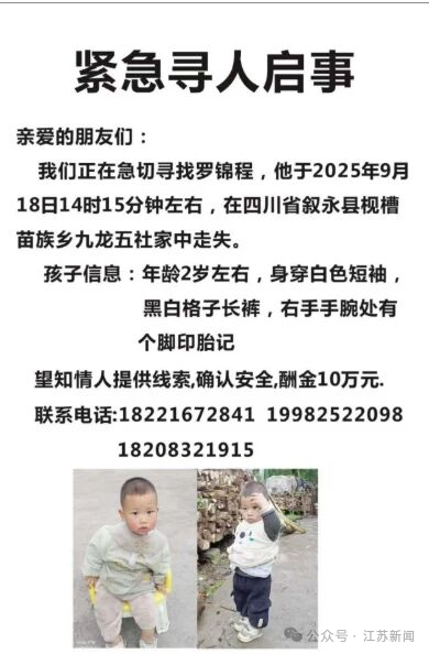 “宝贝,别再流浪了,家永远为你留着门,年夜饭的碗筷为你摆着……快回来吧,回到我们身边,一起过一个完整的团圆年。”四川泸州叙永县2岁男童罗锦程于2025年9月18日下午在村里家中失踪,迄今已近5个月。