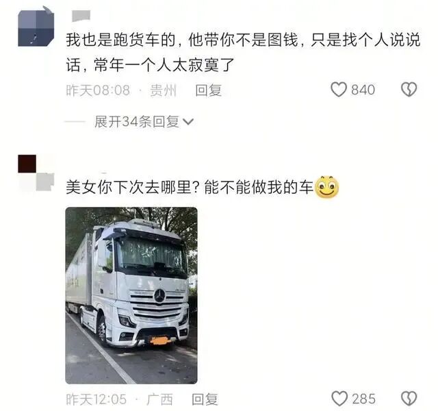 不少货车司机感慨:“他带你不是图钱,只是想找个人说说话,常年一个人跑大车太孤单了。”