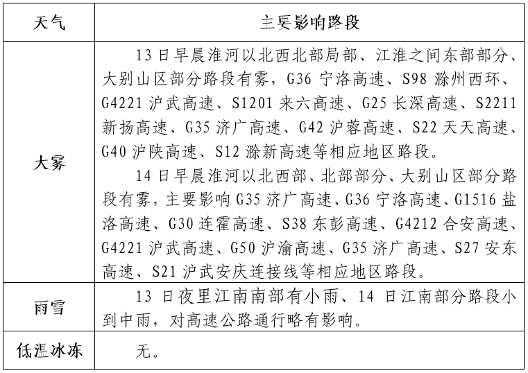 此外,13-14日早晨淮河以北部分地区和本省山区有大雾天气。