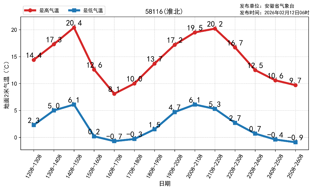 未来两周淮北、合肥和黄山市最高、最低气温预报