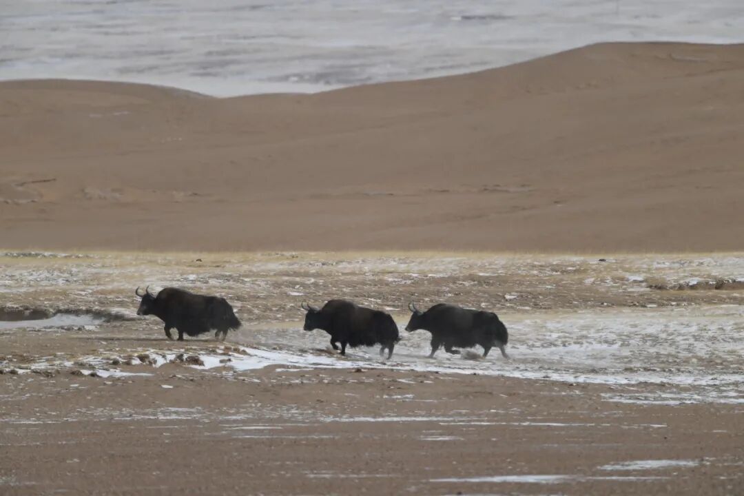 窗外景色仿佛凝固——除了远处连绵的雪山,就是大片大片的黄:枯黄的草、浅黄的沙,偶尔阴山处覆着一层薄雪,算是这荒原上唯一的点缀。直到视野里出现一个个移动的黑点,我们顿时来了精神。
