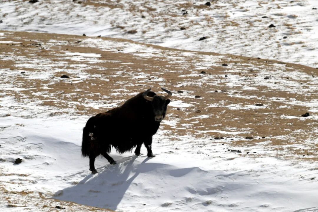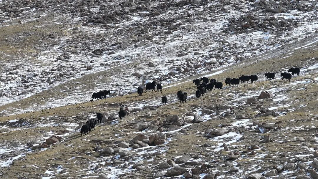 这一路遇到的野牦牛之多,连巡山队员都觉得意外:“这个季节它们通常该在海拔更低、更暖和的公路沿线或牧民冬季牧场附近。现在跑到近5000米的高山草场,可能是山下雪太厚,找不到草吃了。”