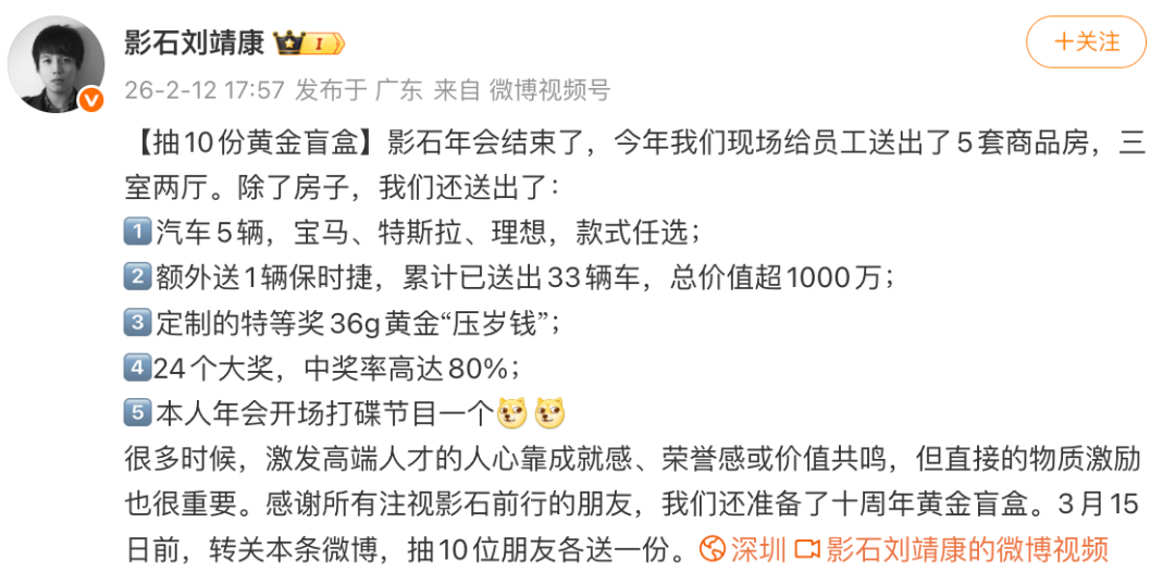 一名影石创新的员工告诉南都·湾财社记者,特别贡献奖是一辆价值160万左右的保时捷,特别贡献大大奖送出多套房产。影石Insta360的年会,常常因为“壕无人性”的年会福利而出圈,该公司已连续多年向员工赠送汽车和黄金,累计送出27台新车,总价值超900万元。