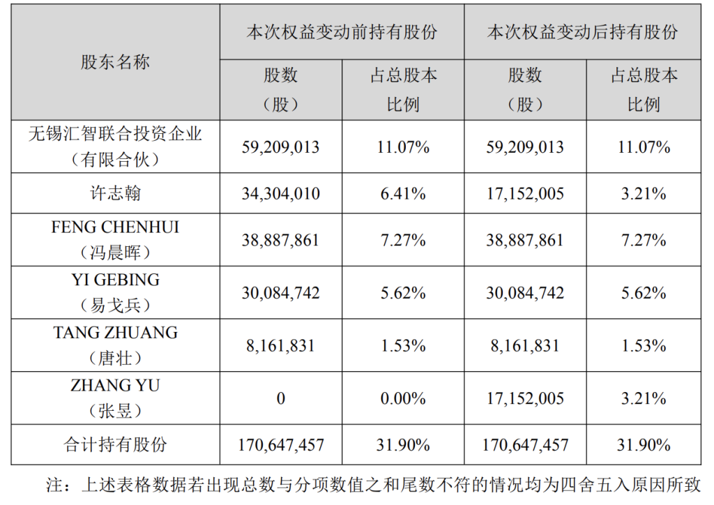 根据许志翰与张昱签订的《离婚财产分割协议》,许志翰将其直接持有的公司无限售条件流通股份17152005股,占公司总股本的3.21%,分割至张昱名下;张昱直接持有公司股份17152005股,占公司总股本的3.21%。
