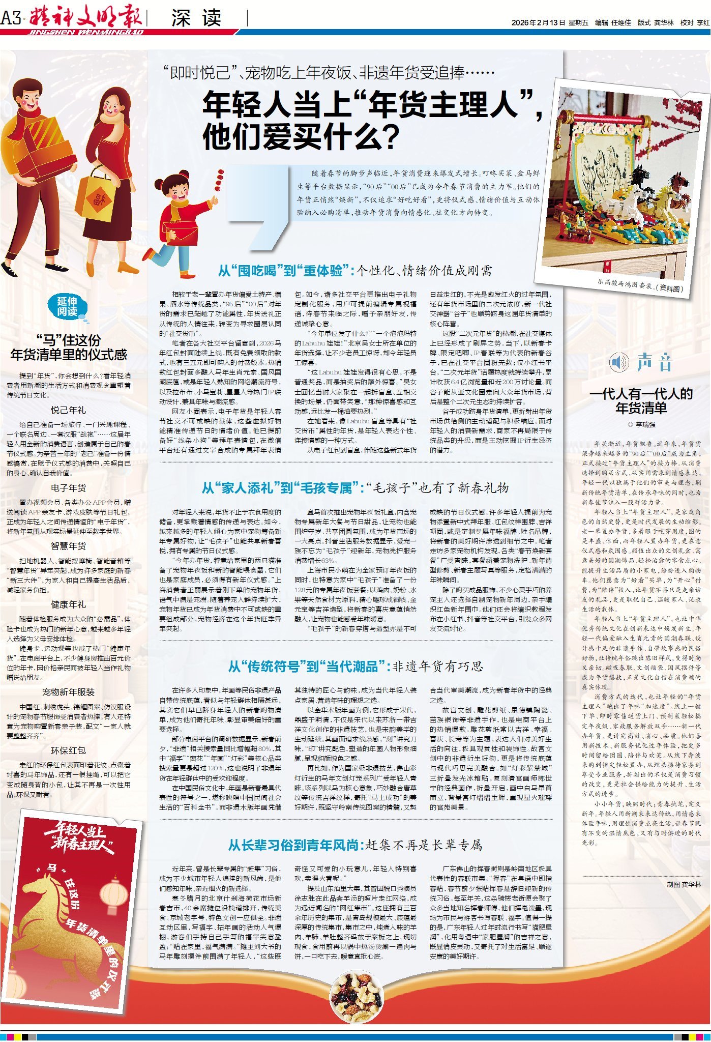 小小年货,映照时代;青春执笔,定义新年。年轻人用新潮来表达传统,用情感来体验年味,用理性消费点亮生活,让春节既有不变的温情底色,又有与时俱进的时代光彩。