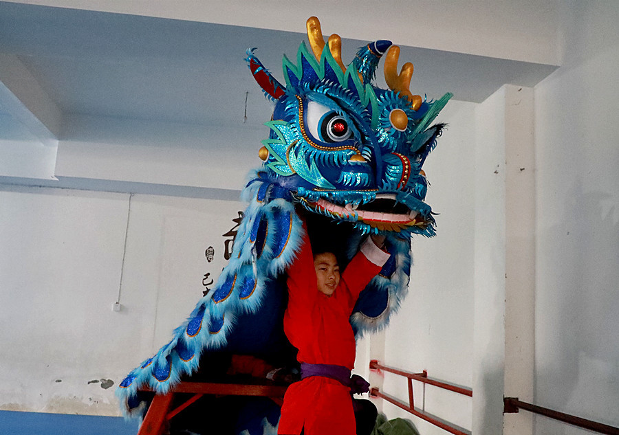 同样12岁的女孩熊芮上小学起就开始练习武术和麒麟灯,但中间有几个月缺席了。“觉得有点累,就没练了。后来看到他们的表演很威风,又来了。”孩子有点不好意思。虽然不是第一次表演,但这次上春晚感觉有点紧张,“春晚要直播,我就练得更勤奋,想表演得更好一点。”