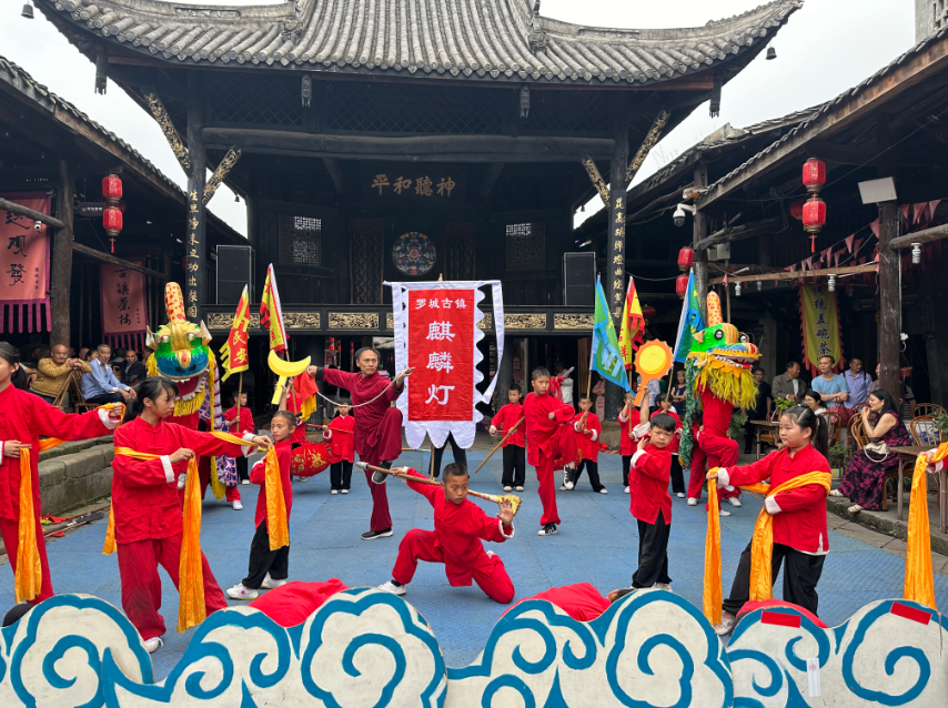 近年来,每逢春节等重大节日,罗城古镇船形街古戏楼前就会上演麒麟灯。罗城麒麟灯根据民间传说“麒麟送子”的情节展开,集舞蹈、音乐、武术、美术于一体,是省级非物质文化遗产。据考证,罗城麒麟灯在清代由客家移民带来,与武术、当地风俗结合后,节目越来越丰富,表演者最多可达上百人。