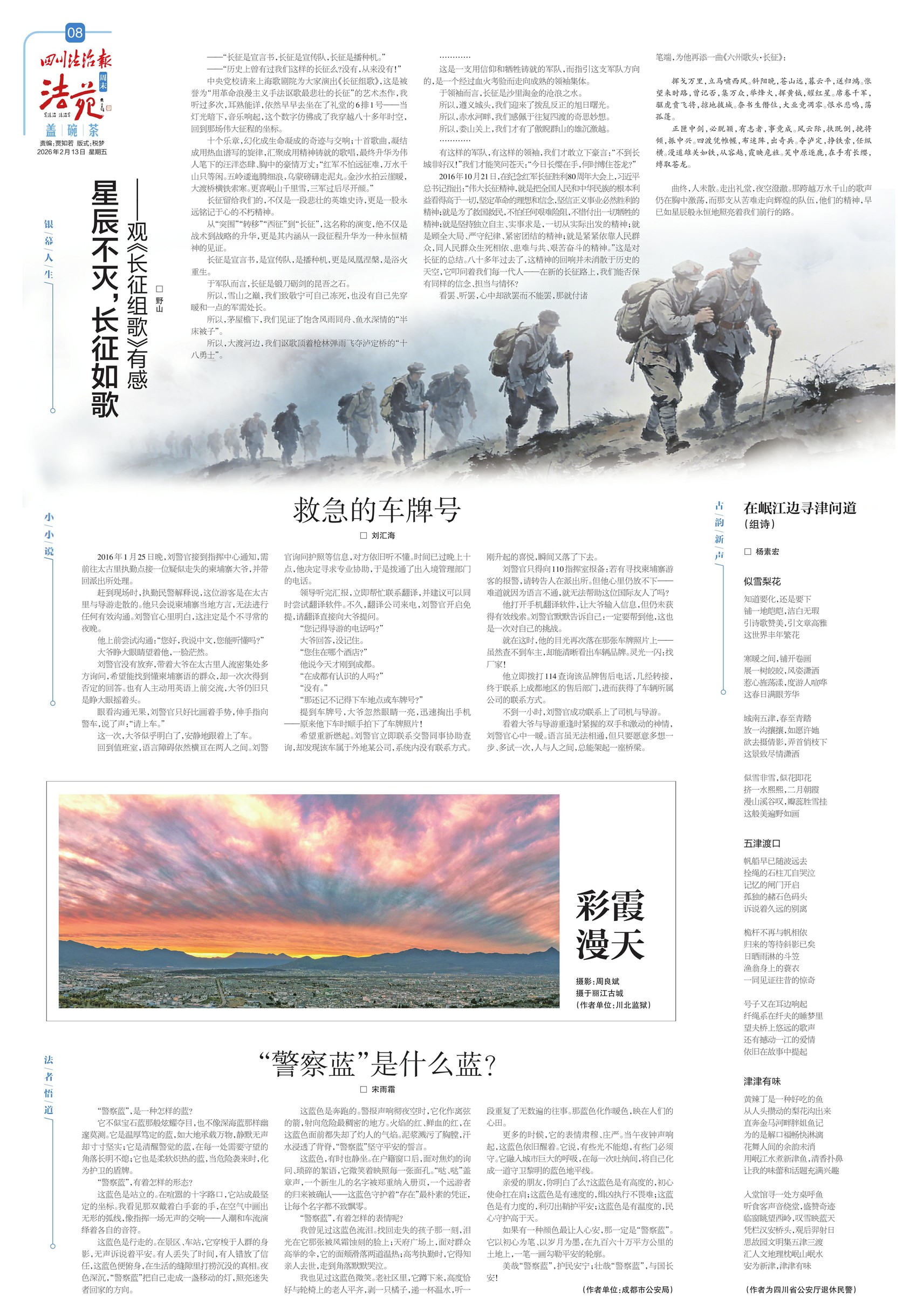 “警察蓝”,有着怎样的表情呢?我曾见过这蓝色流泪。找回走失的孩子那一刻,泪光在它那张被风霜蚀刻的脸上;天府广场上,面对群众高举的伞,它的面颊滑落两道温热;高考执勤时,它得知亲人去世,走到角落默默哭泣。