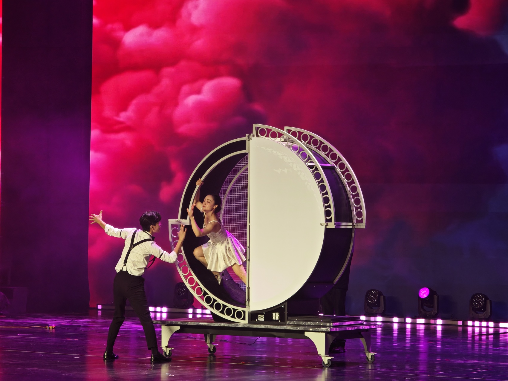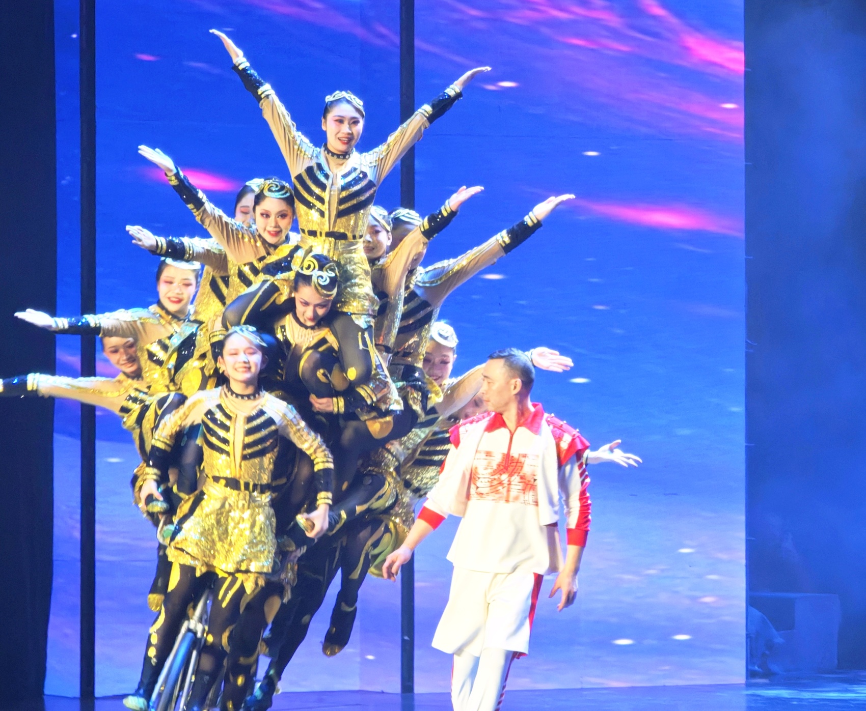 杂技《星耀飞骑》中,单车演员在高台方寸之间完成单轮定车、跳跃转向等连续动作,平衡技巧引发现场观众一个又一个惊呼。