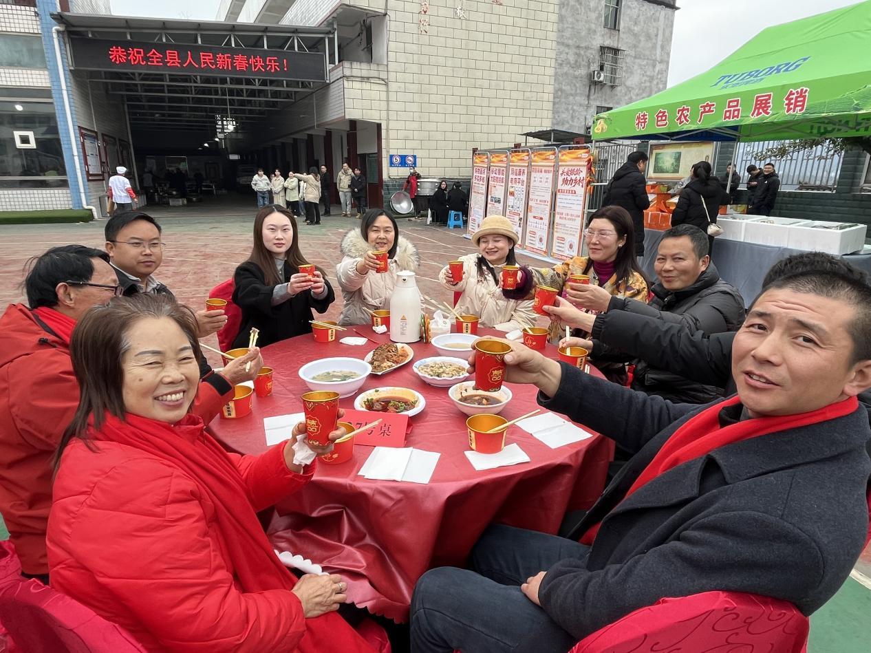 中午12时,热气腾腾的苍溪特色“十大碗”陆续上桌,团年饭正式开席。各级领导与农民工代表围坐共餐,话家常、谈乡情、聊期盼,现场氛围其乐融融、温馨和谐。