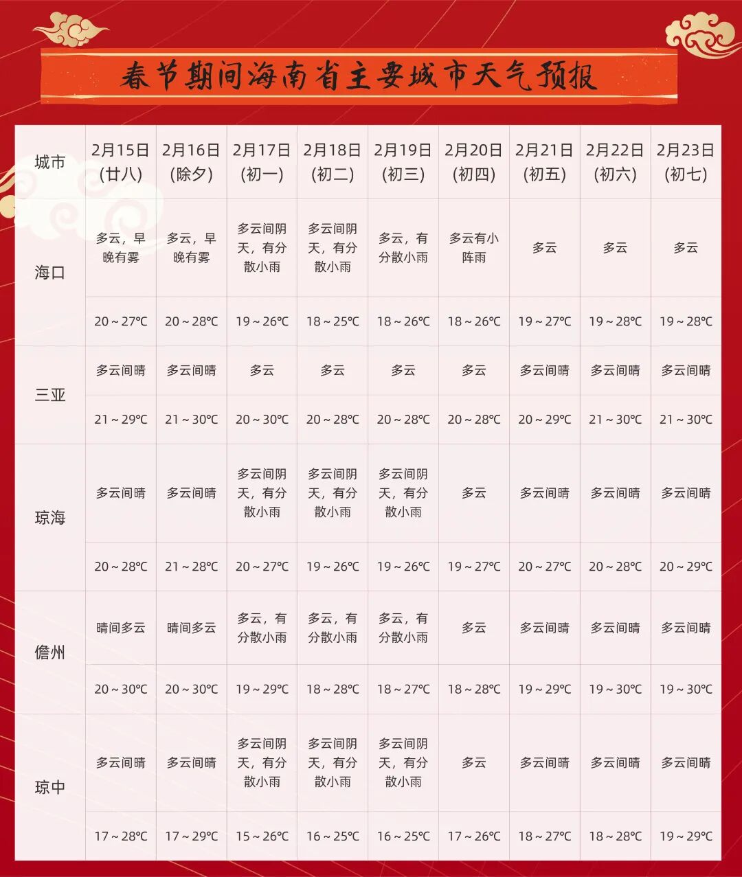 17日(初一)~19日(初三),受弱冷空气影响,海南全岛多云间阴天,北半部局地有小雨。最高气温五指山以北地区24~27℃,五指山以南地区27~30℃;最低气温海南全岛大部地区15~20℃。