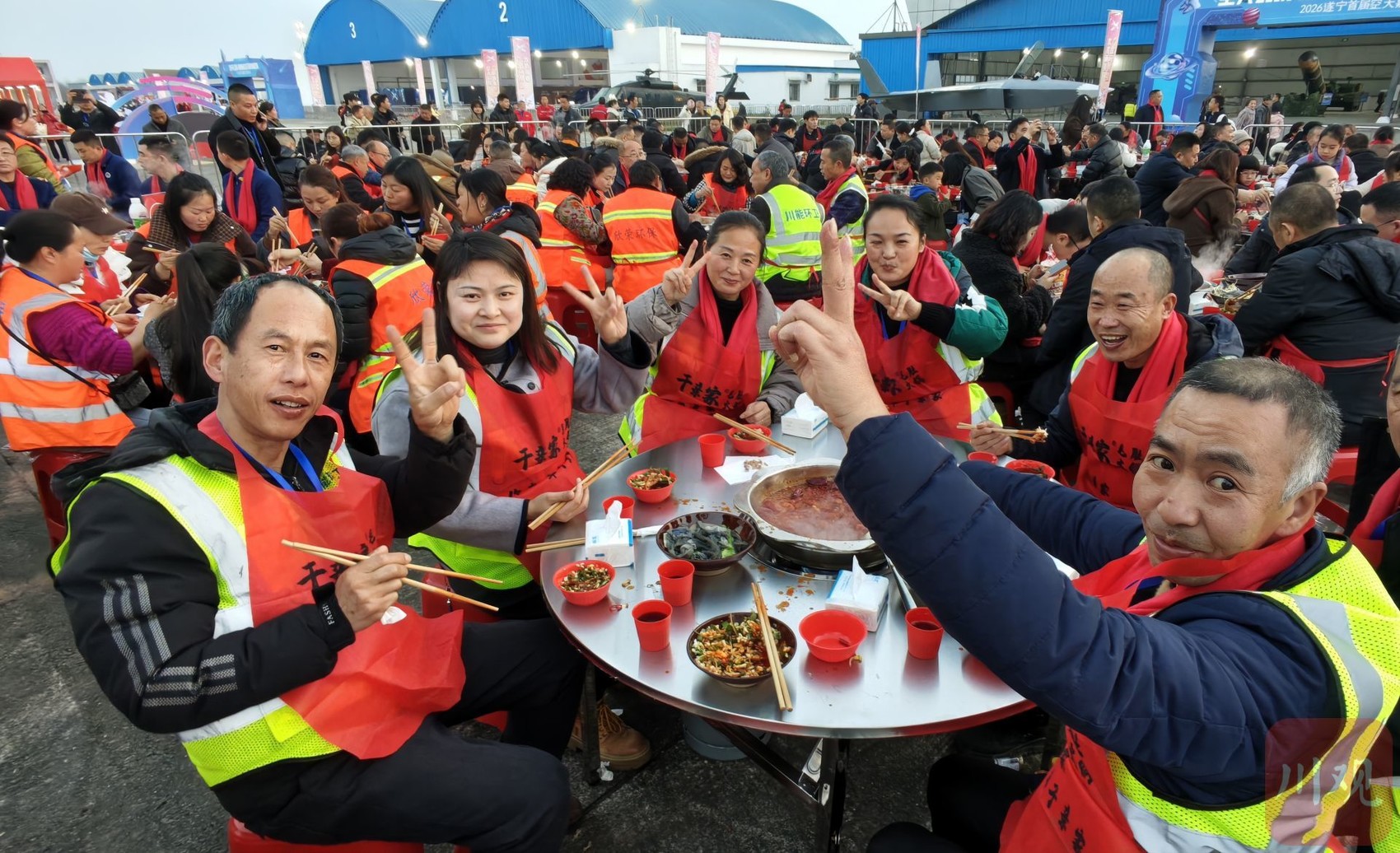 落日余晖,飞行表演的队伍划破长空,千人火锅宴也早已热气腾腾,开幕式现场融合空天科技与川味民俗,既有满满科技感,又有浓浓烟火气。