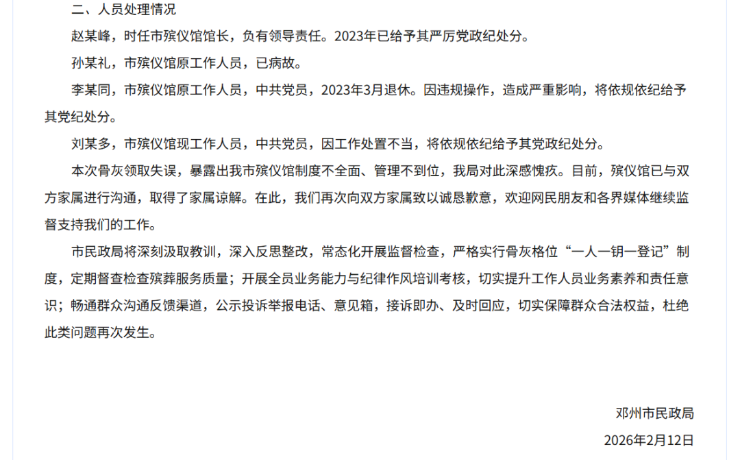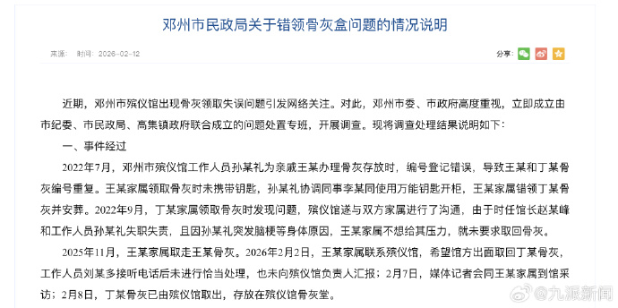 2月12日,河南省邓州市民政局发布“关于错领骨灰盒问题的情况说明”。