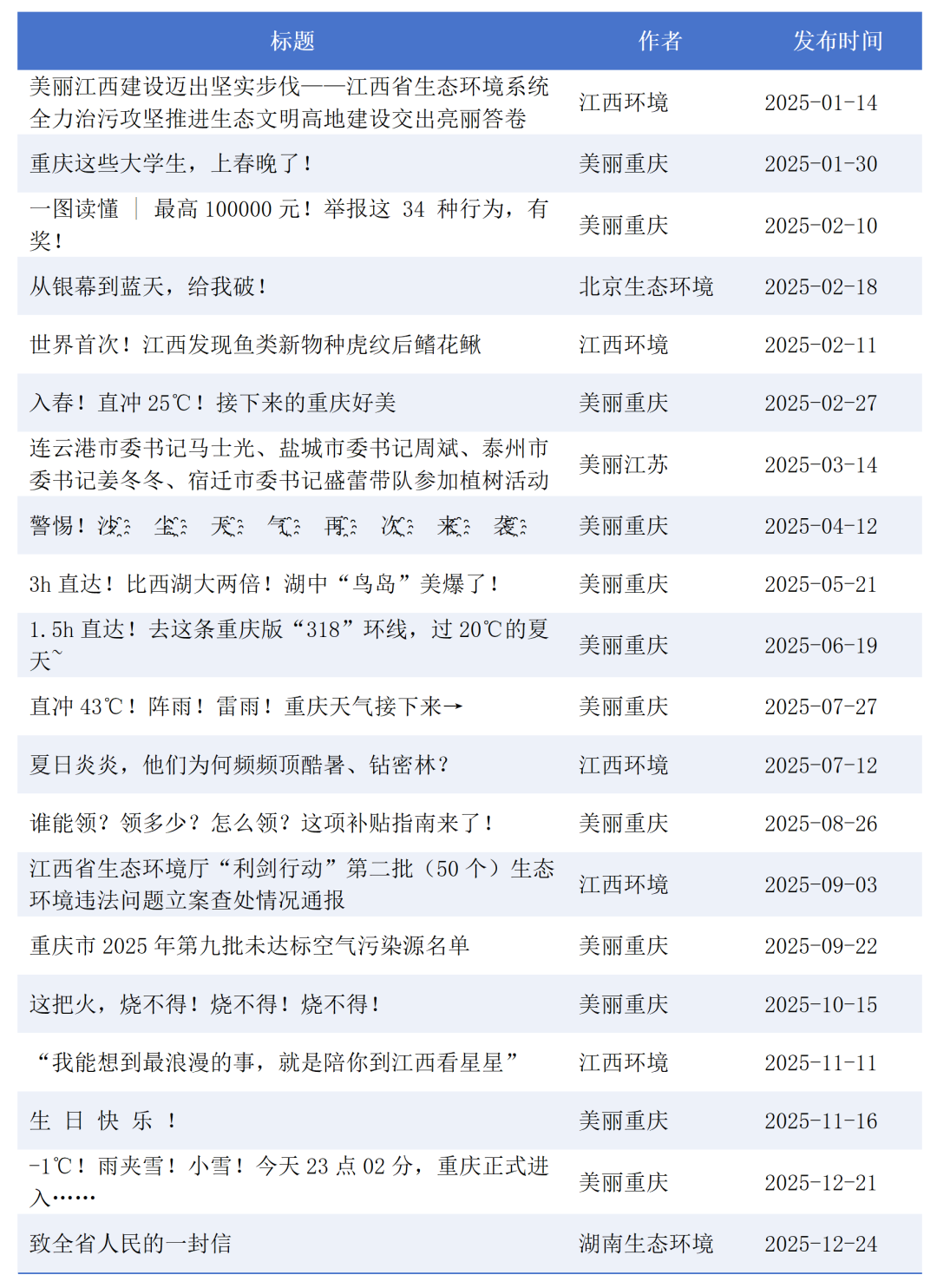 统计发现,2025年全国生态环境系统微信矩阵共有高阅读量(阅读量超过2万+)文章273条,其中省级206条、地市级67条。全年共有20条微信文章阅读量超过10万+ ,其中重庆数量最多,江西位列第二,北京、江苏、湖南也均有内容成功破圈。