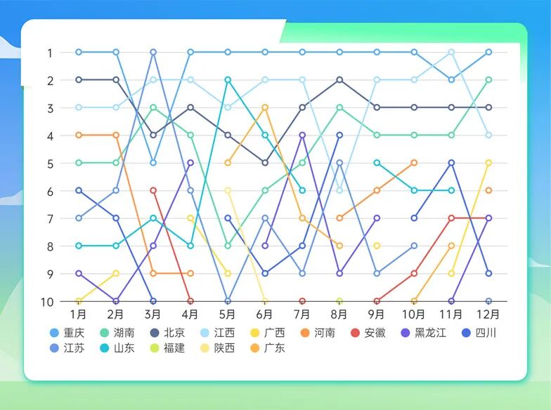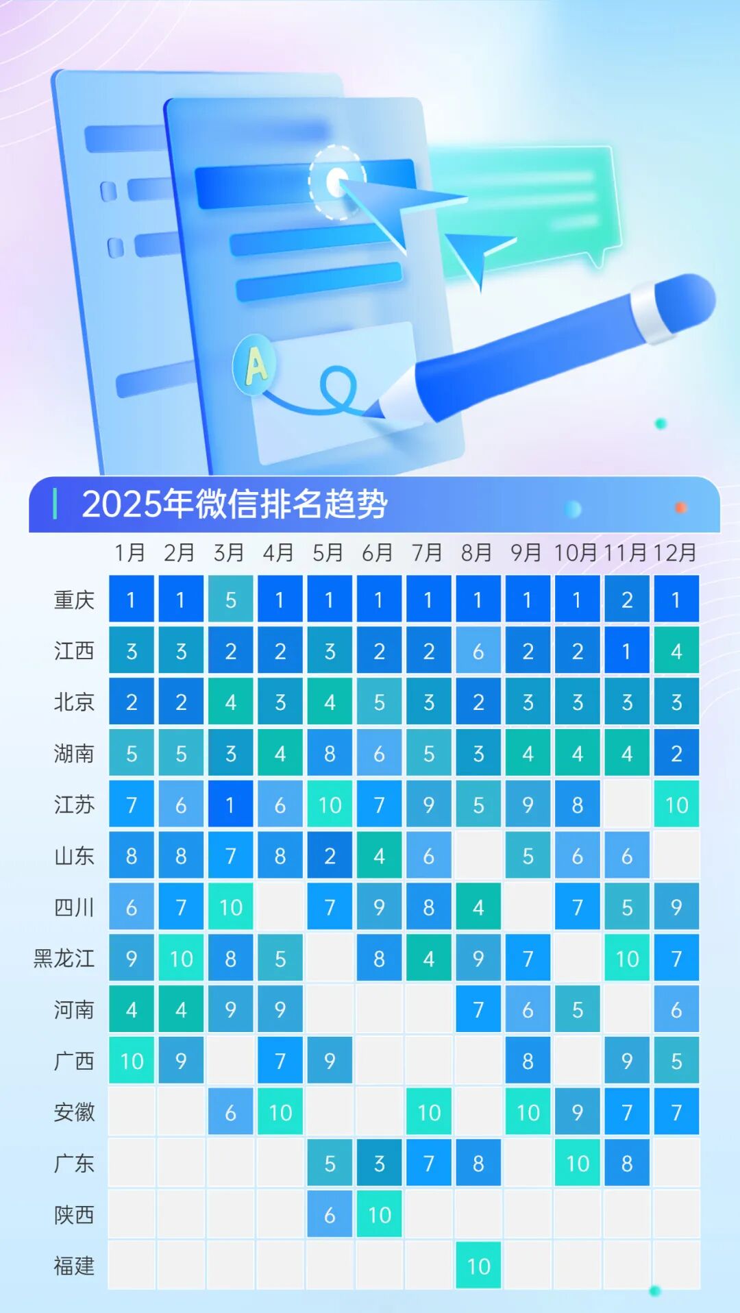 梳理2025年度生态环境政务微信排名情况,有14个省份曾跻身微信榜单前十,其中重庆有10次占据榜首,江西、北京表现稳健,位列第一梯队。湖南凭借自身的特色与优势,始终稳稳处于前十名的行列,河南、四川、山东、江苏、黑龙江、广西等地排名虽有波动,也是榜单的常客。
