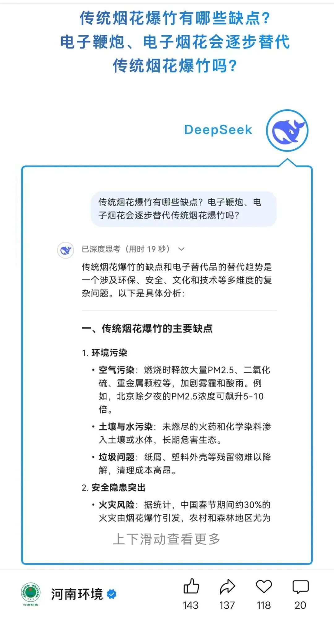 在技术奔流向前的时代,河南与AI对了一次话。河南推文《对话顶流AI,DeepSeek 为这个问题指出了一条新路径!》,围绕烟花爆竹话题,由AI分析解答“河南发展电子鞭炮产业是否赚钱”“政府该如何发力” 等问题。这种 “对话AI” 的呈现形式在解读产业发展的同时,也点明了传统烟花爆竹燃放的弊端,让绿色发展理念更易被受众接受。