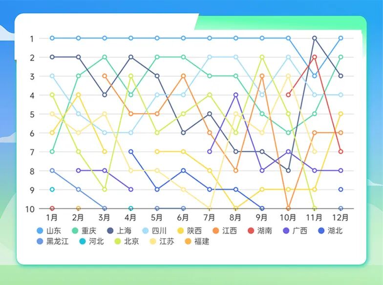 梳理2025年度生态环境政务微博排名情况,有14个省份曾位列前十。山东除11月之外,全年稳居榜首,体现出账号持续的影响力。上海、重庆、四川等地凭借出色的政务宣传工作收获广泛关注,其中上海在11月成功登顶。北京、江苏、陕西、广西、江西名次虽有波动,但表现较为稳健。