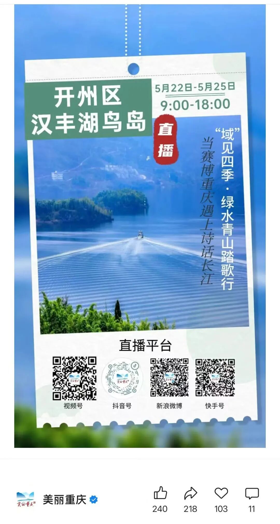 当生态环境宣传与文旅相遇,重庆给出了亮眼答卷。5月22日国际生物多样性日,重庆在汉丰湖开启《“域” 见四季:绿水青山踏歌行》直播活动,让湖域生态之美透过镜头触达大众。作为本次直播的预热推文,《3h直达!比西湖大两倍!湖中 “鸟岛” 美爆了!》立足汉丰湖国家级美丽河湖优秀案例的定位,在宣传其独特生态资源、宜人生态本底的同时,融合旅游体验,让观众沉浸式感受生物多样性之美,也为美丽重庆打造了鲜明的传播记忆点。推文还同步附上自驾路线、观鸟贴士等实用信息,把宣传内容转化为公众 “即刻可出发” 的出行指南。