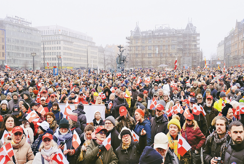 现任美国政府多次以所谓“国家安全”为由扬言要得到格陵兰岛,并声称不排除动用武力的可能性。图为当地时间2026年1月17日,丹麦民众在首都哥本哈根的市政厅广场游行示威,抗议美国企图控制格陵兰岛的行径。 新华社记者 张玉亮/摄