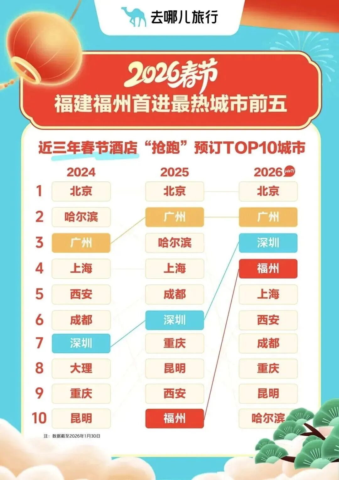 各大线上旅游平台的数据给出了最直观的印证:“去哪儿旅行”春节酒店预订榜单上,福州首次超越上海,跃居全国第4名;携程《2026马年春节出行预测》中,福州以整体旅游订单量同比89%的增幅强势上榜国内黑马目的地;同程旅行春节国内酒店预订热门城市TOP10、途家春节民宿预订量前十——福州全部在列。