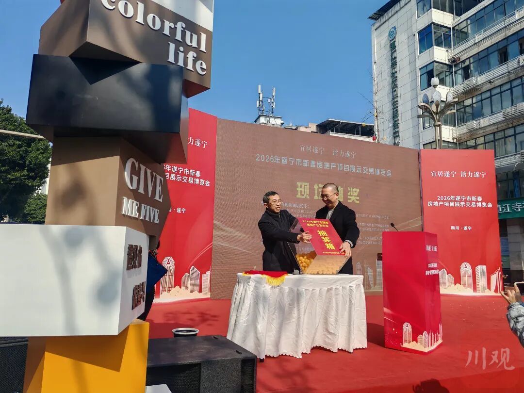 2月12日,遂宁市船山区中心商业区步行街广场上,川剧变脸吐火掀起喝彩,乐队弹唱引得市民驻足,而在展区中央的透明抽奖箱前人头攒动,“宜居遂宁 活力遂宁”2026年遂宁市新春房地产交易博览会在此开幕。