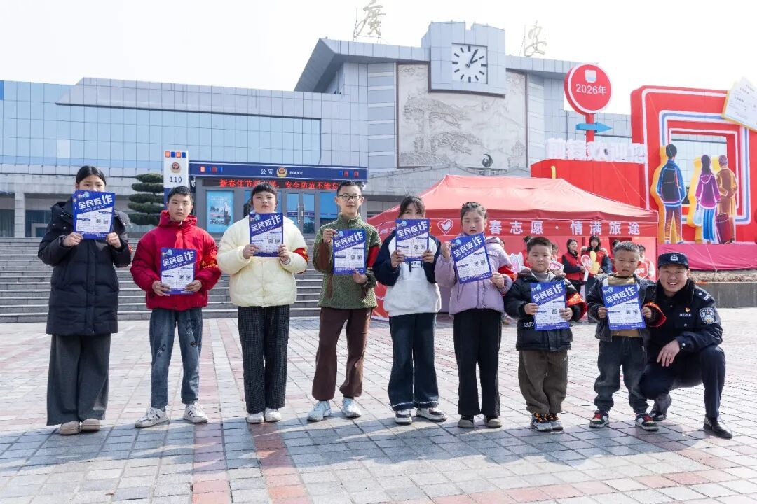 “接到陌生电话,一定要先问警察!”孩子们踮起脚尖,将反诈宣传册递到返乡旅客手中,用清脆响亮的声音普及防骗知识。