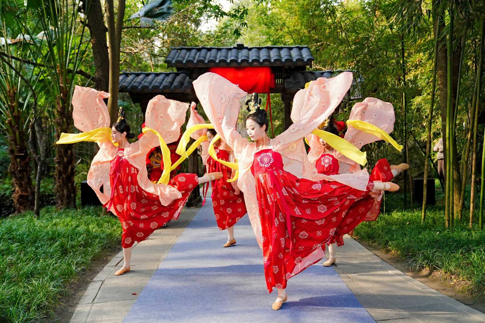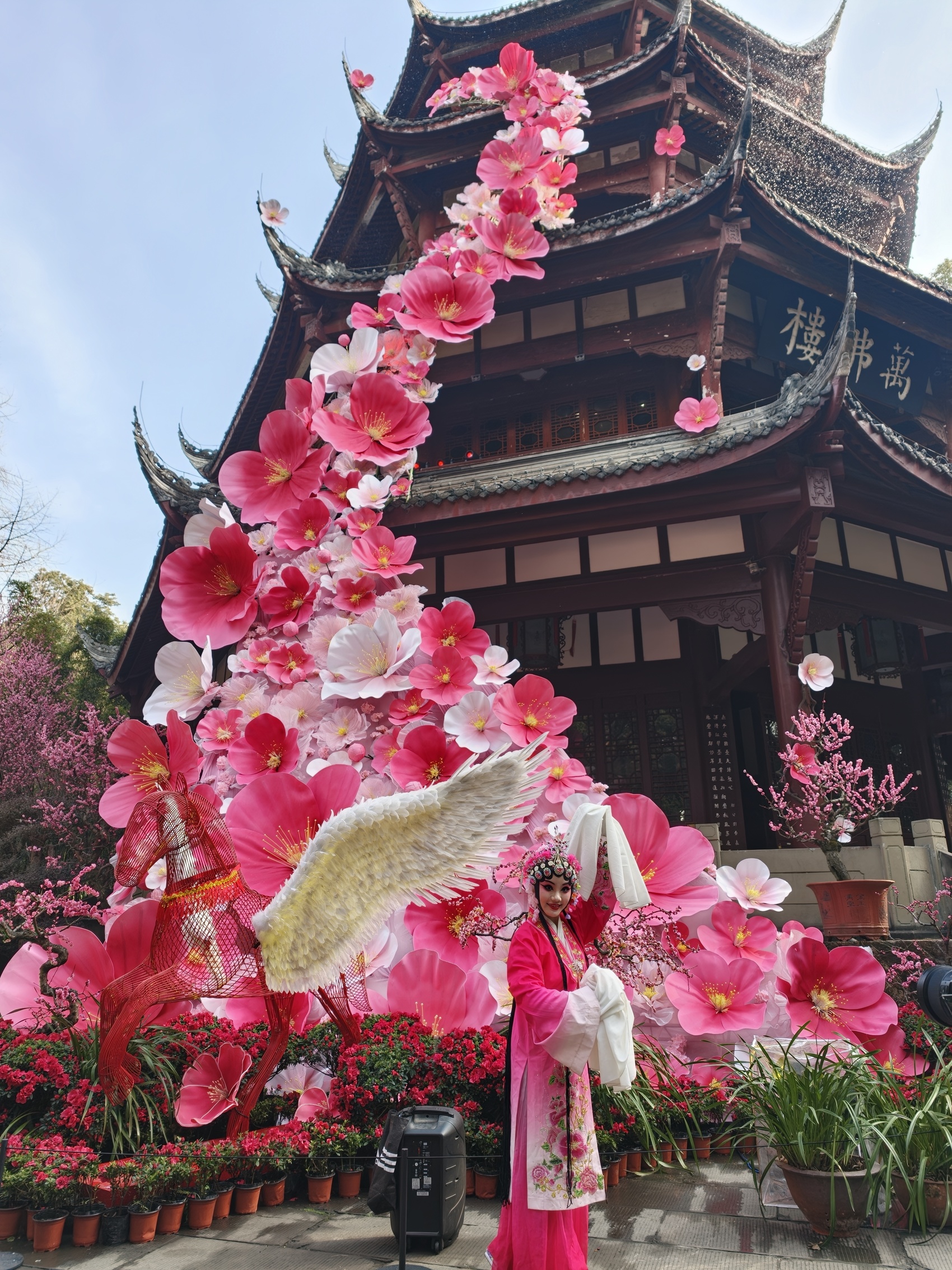 上午10点,杜甫草堂万佛楼前锣鼓初响,唐风仕女衣袂轻扬,舞狮腾跃喜气洋洋。在“杜甫”与福娃巡游引领,现场观众共同步入杜甫草堂的春天。