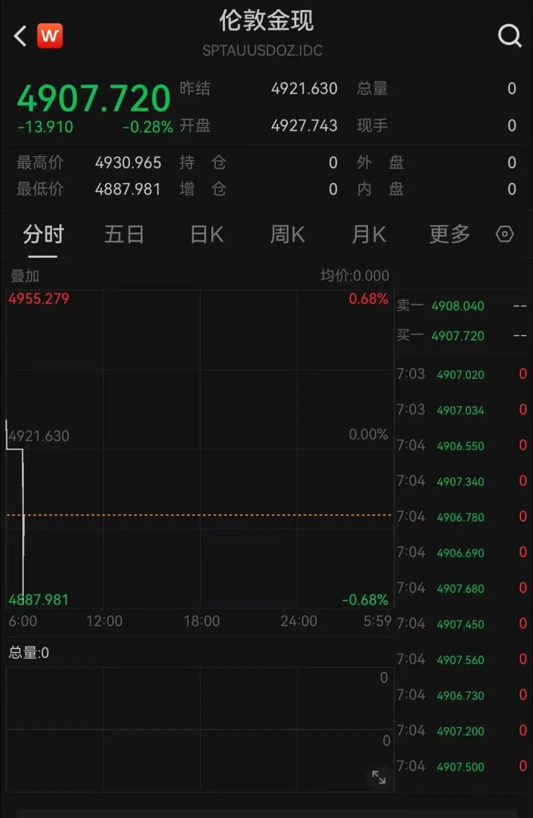 截止到2月13日7:02,伦敦金现报4907.720美元/盎司。