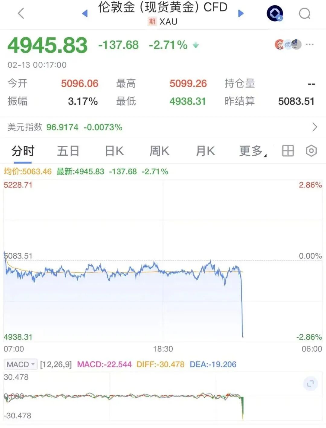 据中国基金报消息,北京时间2月13日凌晨,金价闪崩,伦敦黄金现货价格直线下挫,大跌2.71%。
